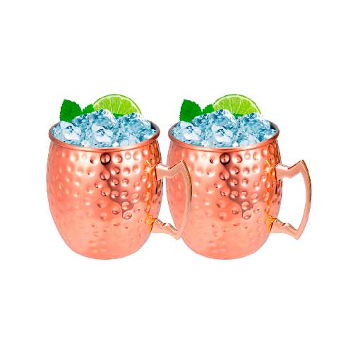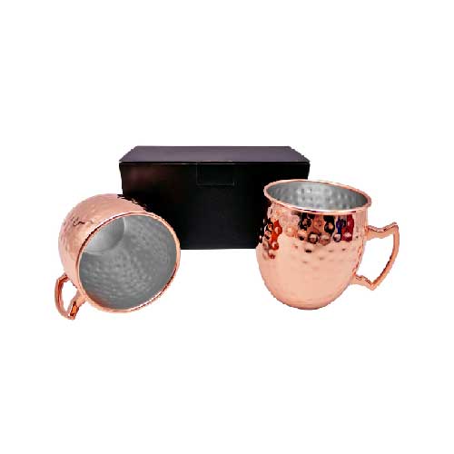 Set de 2 tazones de acero inoxidable electro plateados en cobre con puntos martillados y asa de Zamak. Presentación en caja de cartón negra.